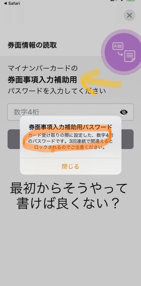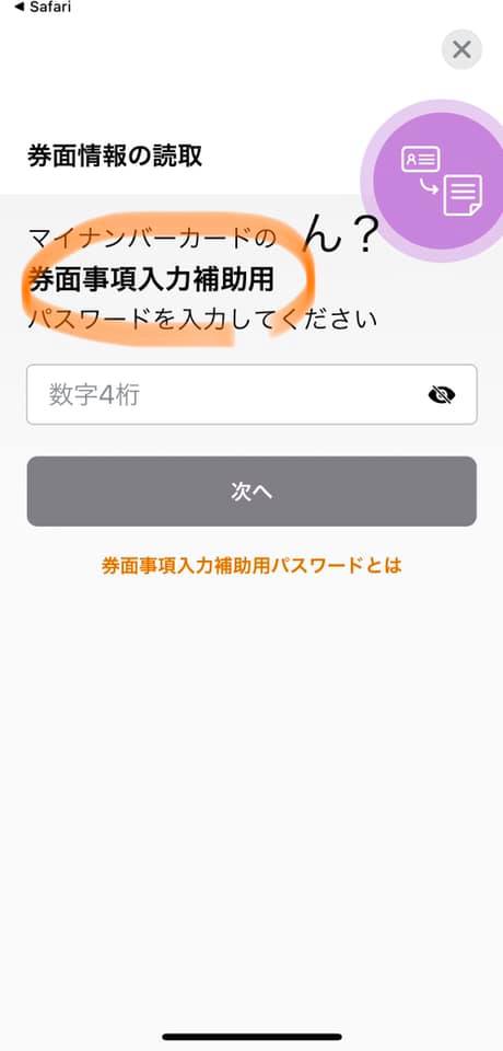 ようやく暗証番号を入れる場面へ到着。ここからは「券面事項入力補助用パスワード」と表記が変わっています。マイナンバーカード取得時にいくつかのパスワードを設定しているので、どのパスワードなのかわからず、注意書きをクリックして入力しました。