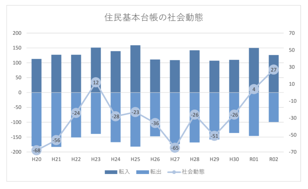 神山町の人口推移を見ると1970年代は約1万3000人でしたが、徐々に減少し、2022年には5000人弱となっています。この数字だけ見ると「高齢過疎化地域」という捉え方をしてしまいますが、社会動態を見ると認識が変わります。